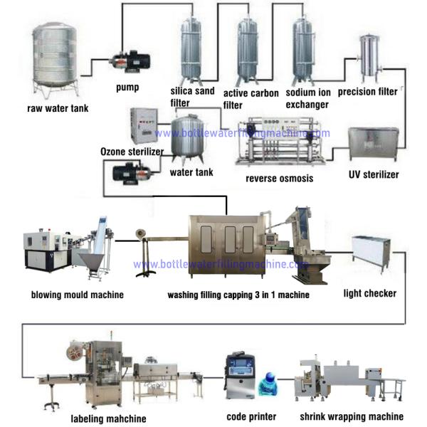 (1)water filling line/liquid filling line includes: Washing-filling-capping 3 in 1 machine, lamp inspection, label shrinking machine, inkjet printer, hot shrink film packer and conveyors. It is a full automatic production line.