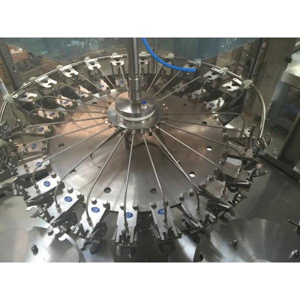 The bottle enters into the rinsing part of three-in-one machine through air conveyor. The gripper installed on the rotary disk catches bottle and turns it over 180 degrees and makes the bottleneck face ground. In the special rinsing area, the nozzle on the gripper sprays juice to rinse bottle inwall. After rinsing and draining, the bottle turns over 180 degrees along the guide rail and make the bottleneck faces sky. Then rinsed bottle is transferred to the filling part through poking bottle starwheel. The bottle that enters into the filler is hold by neck holding plate. The filling valve acted by the cam can realize up and down. It adopts equal pressure filling way. The filling valve opens and begins filling when it moves down and touches thebottleneck, the filling valve move up and leave the bottleneck when it finishes filling, the full bottle is transferred to the capping part through hold neck transition poking wheel. The stop screwing knife holds the bottleneck, keeps bottle upright not rotating. The screw capping head keeps in revolution and autorotation. It can finish a whole capping course including catching, pressing, screwing, discharging through the action of the cam. The full bottle is transferred to bottle outlet conveyor to the next process through starwheel. The whole machine is enclosed with windows, the height of enclosed window is higher than the peak of the 3 in 1 machine, in the bottom of the enclosed window has return air outlet.